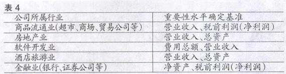 對于一些特殊行業,我們在確定其重要性水平計算基準時,根據實際情況需要考慮其他一些指標。大多數商品流通業的公司,資產總額較小但營業收入很大,而且審計的重點是利潤表,因此不宜用資產總額為基準從而確定過低的重要性水平。對于房地產公司來說,其生產經營具有較強的周期性,稅前利潤不能較好的體現其經營狀況,因此不宜用稅前利潤來確定重要性水平。對于軟件開發公司而言,其生產經營亦具有較強的周期性,一般資產規模較小,研發周期較長且費用支出較大,因此資產總額和稅前利潤(凈利潤)不能客觀及時的體現其經營狀況,不宜將其作為確定重要性水平的基準。對于酒店行業,大多資產總額及營業收入較大,而稅前利潤偏低,因此不宜采用稅前利潤來確定重要性水平。對于金融行業,一般資產總額較大,資產負債率較高(其中銀行類基本在90%以上;證券公司70%左右)而總資產周轉率低(其中銀行類基本在3%左右;證券公司10%左右),因此不宜采用資產總額、營業收入等來確定重要性水平。