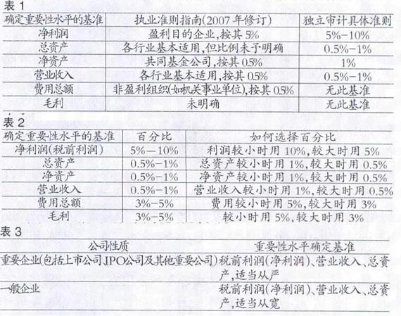 在計劃階段確定重要性水平時,執業人員應先選擇一個,除當的基準,再選用適當的百分比乘以該基準,從而得出財務報表層次的重要性水平。在實務中,有許多匯總性財務數據可以用作確定財務報表層次重要性水平的基準。《獨立審計具體準則第10號——審計重要性》第12條規定:“注冊會計師應當合理選用重要性水平的判斷基礎,采用固定比率,變動比率等確定會計報表層次的重要性水平。判斷基礎通常包括凈利潤、總資產、凈資產和營業收入等。”并結合實務給出了一些相應百分比的參考數值(見表1)。《中國注冊會計師執業準則指南》(2007年修訂)則又新增了兩個基準,即費用總額和毛利,同時對相關基準參考數據予以修訂,具體如下: