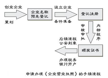 設立企(qi)業(ye)可分為有限(責任)公司、股份制合(he)作企(qi)業(ye)、個人獨(du)資企(qi)業(ye)和合(he)伙(huo)企(qi)業(ye)四(si)類。申請辦理《企(qi)業(ye)營業(ye)執(zhi)照》的手續流程如圖所示。
