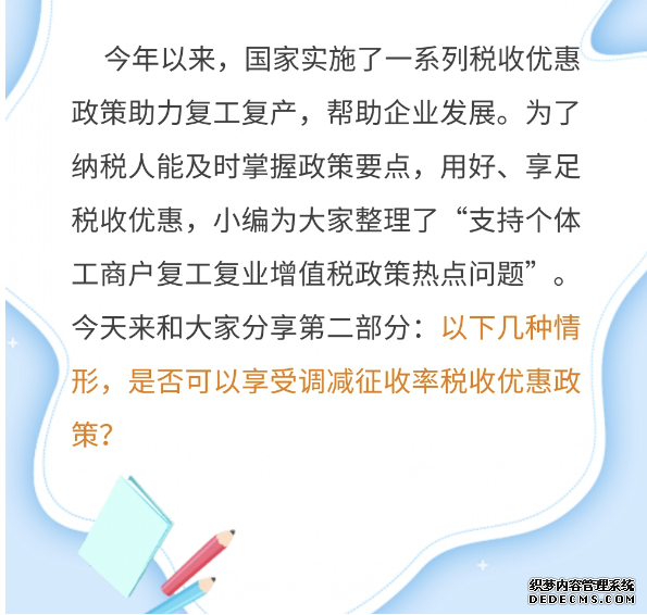 答(da):可以(yi)。根據《財政(zheng)(zheng)部(bu) 稅(shui)(shui)(shui)(shui)務總(zong)(zong)局(ju)關(guan)于(yu)支持個(ge)體工商戶復(fu)(fu)工復(fu)(fu)業增(zeng)(zeng)值(zhi)(zhi)(zhi)稅(shui)(shui)(shui)(shui)政(zheng)(zheng)策的(de)(de)(de)公(gong)(gong)告(gao)》(2020年(nian)第(di)13號(hao))規(gui)定,自3月1日(ri)(ri)至(zhi)5月31日(ri)(ri),對湖北省增(zeng)(zeng)值(zhi)(zhi)(zhi)稅(shui)(shui)(shui)(shui)小(xiao)規(gui)模納(na)稅(shui)(shui)(shui)(shui)人,適(shi)用3%征收(shou)(shou)率的(de)(de)(de)應(ying)稅(shui)(shui)(shui)(shui)銷售收(shou)(shou)入(ru),免(mian)征增(zeng)(zeng)值(zhi)(zhi)(zhi)稅(shui)(shui)(shui)(shui);除湖北省外,其他(ta)省、自治區、直(zhi)轄市的(de)(de)(de)增(zeng)(zeng)值(zhi)(zhi)(zhi)稅(shui)(shui)(shui)(shui)小(xiao)規(gui)模納(na)稅(shui)(shui)(shui)(shui)人,適(shi)用3%征收(shou)(shou)率的(de)(de)(de)應(ying)稅(shui)(shui)(shui)(shui)銷售收(shou)(shou)入(ru),減按1%征收(shou)(shou)率征收(shou)(shou)增(zeng)(zeng)值(zhi)(zhi)(zhi)稅(shui)(shui)(shui)(shui)。根據《財政(zheng)(zheng)部(bu) 稅(shui)(shui)(shui)(shui)務總(zong)(zong)局(ju)關(guan)于(yu)延(yan)長(chang)小(xiao)規(gui)模納(na)稅(shui)(shui)(shui)(shui)人減免(mian)增(zeng)(zeng)值(zhi)(zhi)(zhi)稅(shui)(shui)(shui)(shui)政(zheng)(zheng)策執行期(qi)限(xian)的(de)(de)(de)公(gong)(gong)告(gao)》(財政(zheng)(zheng)部(bu) 稅(shui)(shui)(shui)(shui)務總(zong)(zong)局(ju)公(gong)(gong)告(gao)2020年(nian)第(di)24號(hao))規(gui)定,《財政(zheng)(zheng)部(bu) 稅(shui)(shui)(shui)(shui)務總(zong)(zong)局(ju)關(guan)于(yu)支持個(ge)體工商戶復(fu)(fu)工復(fu)(fu)業增(zeng)(zeng)值(zhi)(zhi)(zhi)稅(shui)(shui)(shui)(shui)政(zheng)(zheng)策的(de)(de)(de)公(gong)(gong)告(gao)》(財政(zheng)(zheng)部(bu) 稅(shui)(shui)(shui)(shui)務總(zong)(zong)局(ju)公(gong)(gong)告(gao)2020年(nian)第(di)13號(hao))規(gui)定的(de)(de)(de)稅(shui)(shui)(shui)(shui)收(shou)(shou)優惠政(zheng)(zheng)策實施期(qi)限(xian)延(yan)長(chang)到2020年(nian)12月31日(ri)(ri)。
