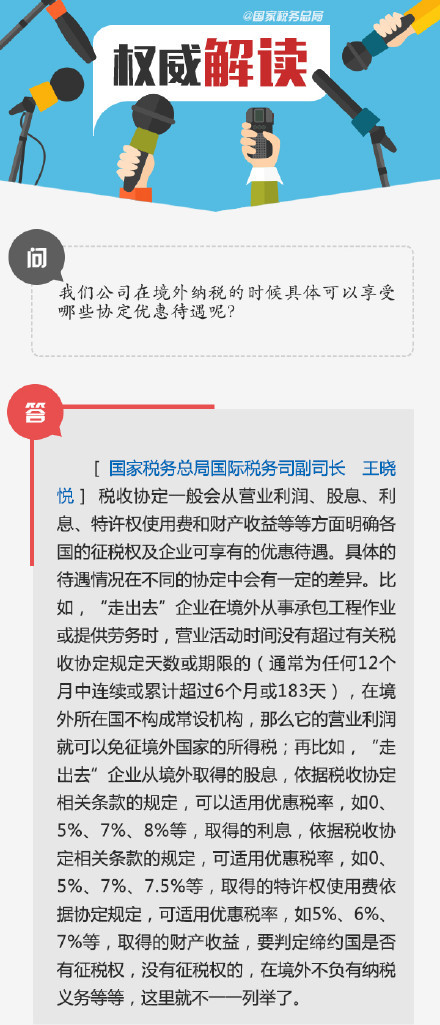 國家稅(shui)務(wu)總局國際稅(shui)務(wu)司(si)副司(si)長王曉悅:稅(shui)收(shou)協定(ding)一(yi)般會從營業利潤(run)、股息、利息、特許(xu)權(quan)(quan)使用費和財產收(shou)益(yi)等(deng)等(deng)方(fang)面明(ming)確各國的征稅(shui)權(quan)(quan)及企(qi)業可享有的優(you)惠(hui)待遇。具體的待遇情況在不同的協定(ding)中會有一(yi)定(ding)的差異(yi)。