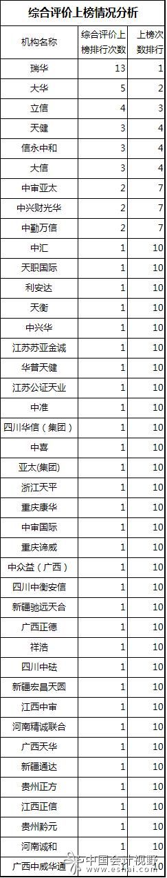 2、以綜合評價計(ji)算,瑞華會計(ji)師(shi)事務所以13次為上榜次數(shu)最(zui)多的機構,具體(ti)上榜次數(shu)排(pai)行(xing)情況如下表: