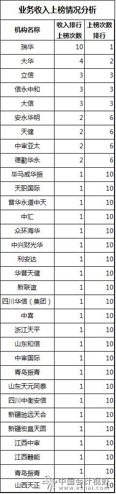據各(ge)地注冊會計(ji)(ji)師(shi)協(xie)會發布的(de)會計(ji)(ji)師(shi)事務(wu)所排(pai)行信息,中(zhong)國會計(ji)(ji)視野對綜合評價和2013年度業(ye)務(wu)收入排(pai)行情況的(de)前五(wu)名進行了分析(xi)。